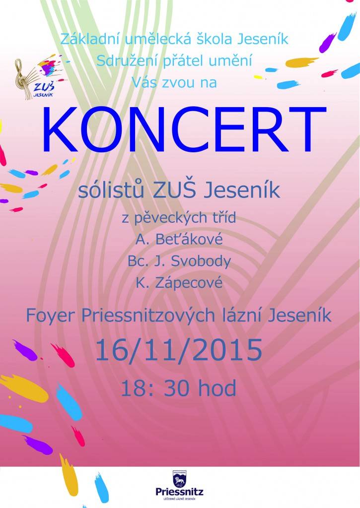 Podvečerní koncert žáků ZUŠ JeseníkPředstaví se studenti ze tříd pedagogů A. Beťákové, K. Zápecové aj. Svobody 16.11.2015 - 18.30 hod. - Hala Hotelu Priessnitz