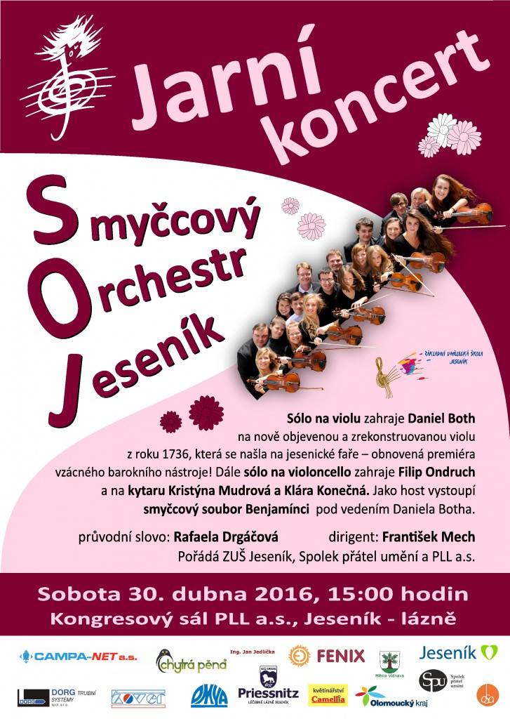JARNÍ KONCERT SMYČCOVÉHO ORCHESTRU JESENÍKsobota 30. 4. - 15 hodin - Kongresový sál PLL a.s. Diriguje František Mech. Průvodní slovo Rafaela Drgáčová. Sólo na violu zahraje Daniel Both na nově objevenou a zrekonstruovanou violu z roku 1736, která se našla na jesenické faře – obnovená premiéra vzácného barokního nástroje! Dále sólo na violoncello zahraje Filip Ondruch a na kytaru Kristýna Mudrová a Klára Konečná. Jako host vystoupí smyčcový soubor Benjamínci pod vedením Daniela Botha. | |