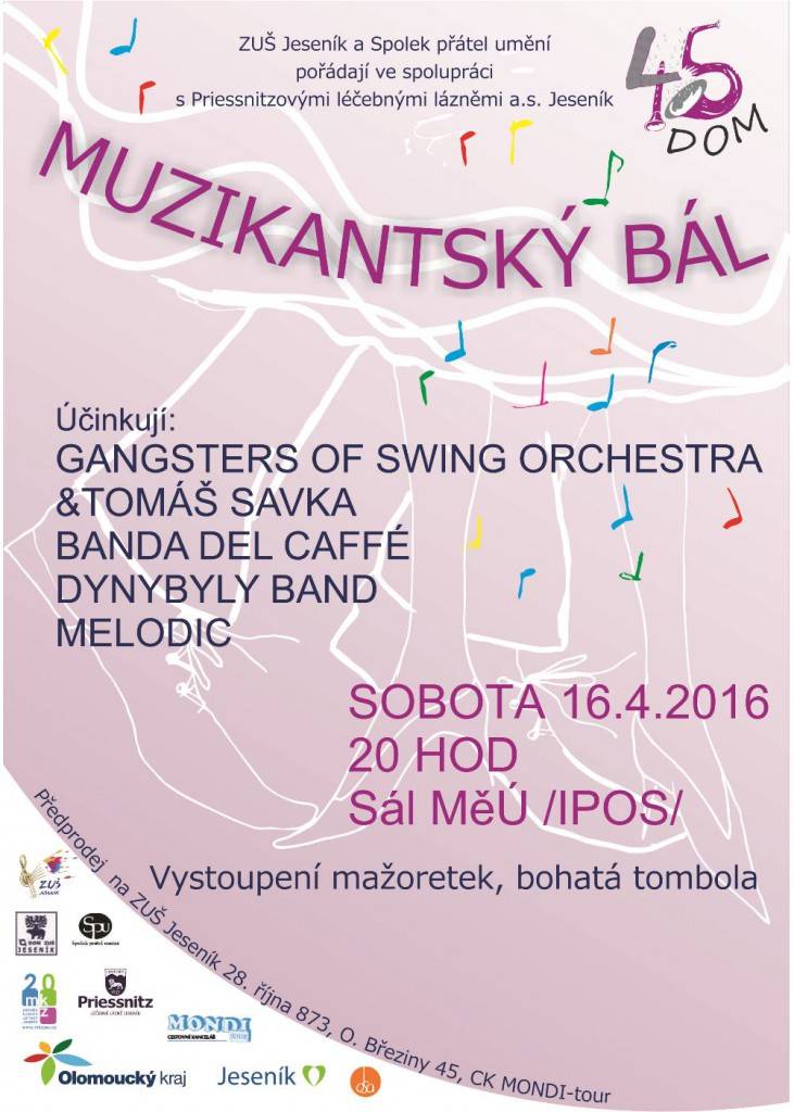 MUZIKANTSKÝ BÁLsobota 16. 4.2016 - 20 hodin - Sál MěÚ (IPOS) K tanci a poslechu hrají: GANGSTERS OF SWING ORCHESTRA & TOMÁŠ SAVKA, BANDA DEL CAFFÉ, DYNYBYLY BAND, MELODIC. Vystoupení mažoretek, bohatá tombola. | |