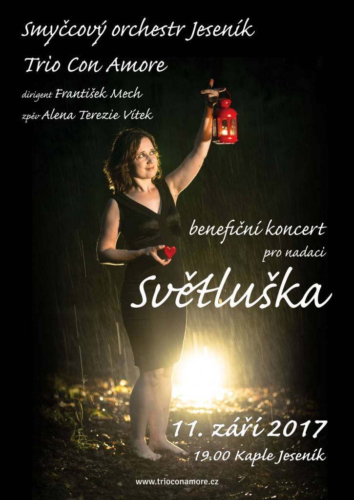 Koncert pro SvětluškuPondělí 11.9.2017 od 19 hodin Kaple Jeseník- Koncert pro Světlušku ZUŠ Jeseník pořádá benefiční koncert pro nadaci Českého rozhlasu Světluška. Koncertu se zhostí Smyčcový orchestr Jeseník pod taktovkou Františka Mecha společně s Triem Con Amore a jejich hostů. Celým večerem nás bude provázet něžný hlas Rafaely Drgáčové. Můžete se těšit na skladby období baroka, klasicismu, ale i moderní písně v úpravě. Světýlkem koncertu bude naše zpěvačka Alenka Terezie Vítek, která už několik let pracuje jako koordinátorka Světlušky. Její hlas potěší a otevře snad každé srdíčko. Během odpoledne budou chodit po městě slečny v tričku Světlušky a v tykadélkách, budou prodávat drobné předměty a vybírat penízky do sbírky. Celý výtěžek z koncertu i odpolední sbírky pak bude na místě předán zástupci z nadace Světluška. Všichni účinkující vystupují bez nároku na honorář. Zkuste se na chvilku nedívat na svět jen očima, ale i srdcem. Těšíme se na Vás a na Vaši podporu, Iveta Neubauer Trojanová (organizátorka sbírky) | |