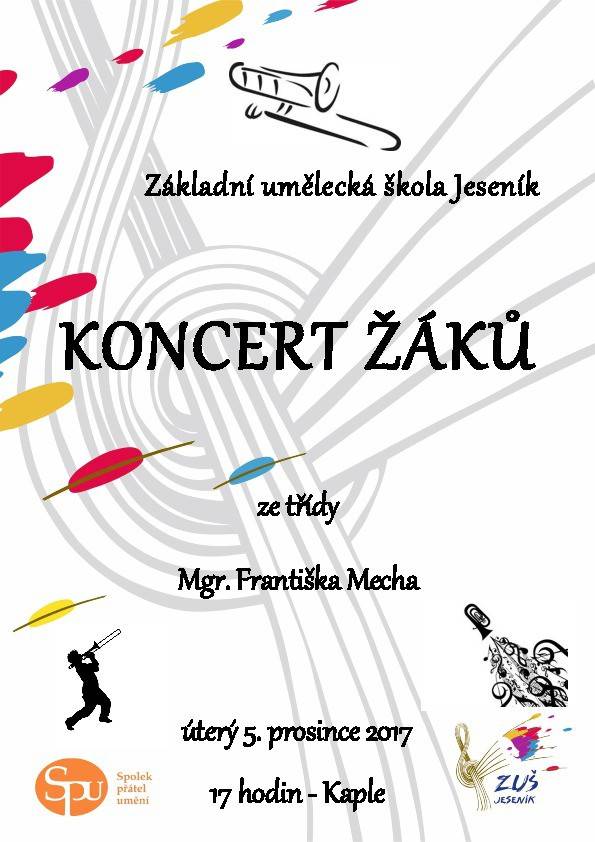 KONCERT ŽÁKŮ ZE TŘÍDY MGR. FRANTIŠKA MECHAúterý 5. prosince v 17 hodin - Kaple Představí se žáci ve hře na trombon, tubu a zobcovou flétnu.
