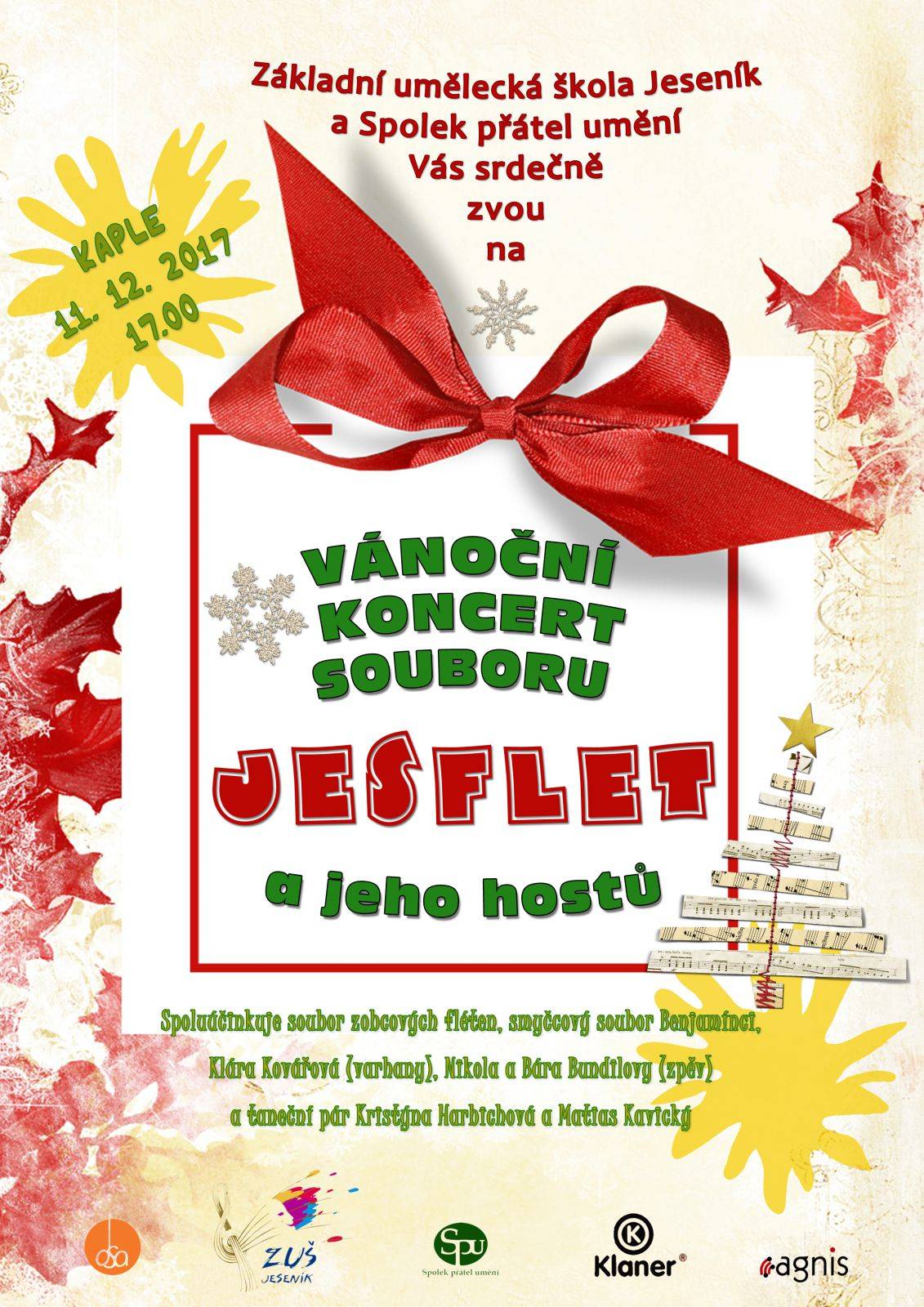 Koncert souboru Jesfletpondělí 11.12.2017 - 17 hodin - Kaple Jako hosté vystoupí žáci pěveckého oddělení A. Beťákové, smyčcový soubor Benjamínci, varhanice Klára Kovářová a žáci Klubu sportovního tance Jesenicka Matias Kavický a Kristýna Harbichová. | |