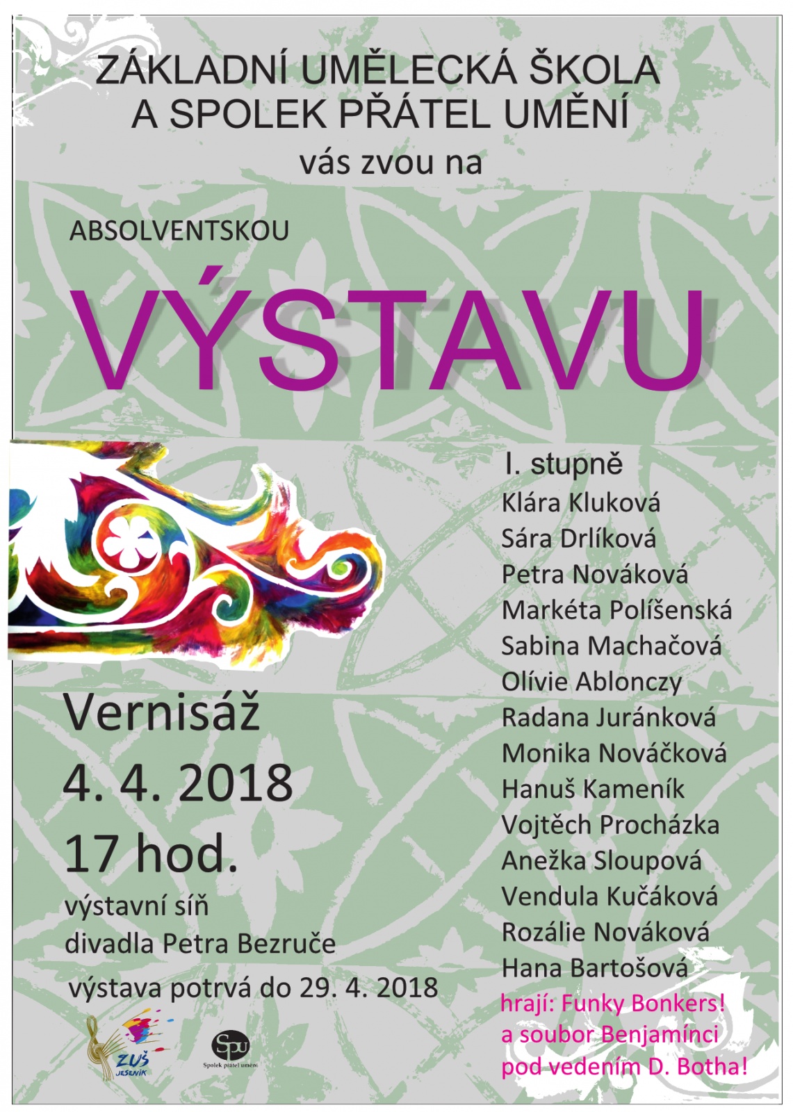 Absolventská výstava I. stupněVernisáž se bude konat 4.4.2018 v 17 hodin ve výstavní síni Divadla Petra Bezruče Výstava potrvá do 29.4.2018