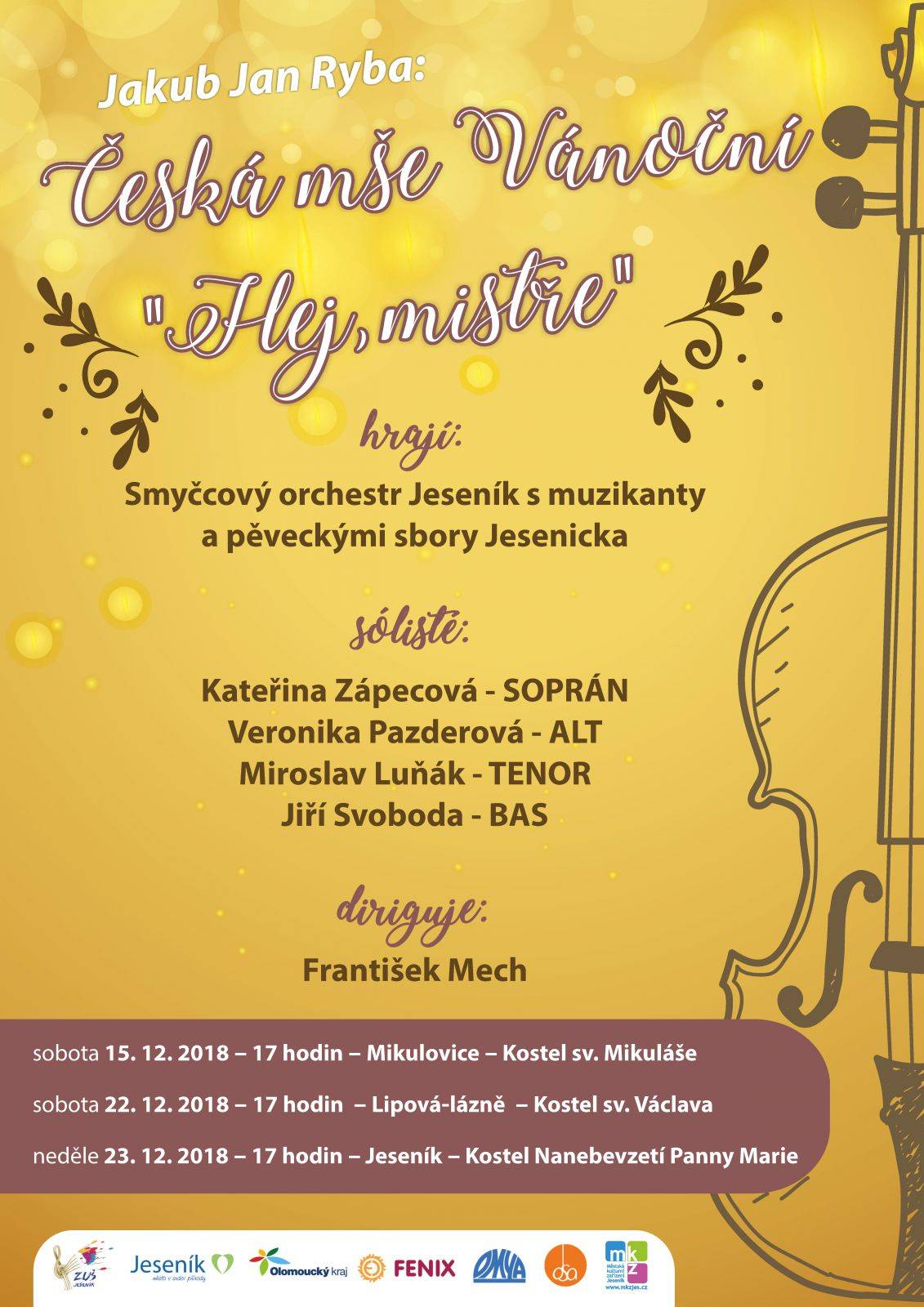 J. J. RYBA - ČESKÁ MŠE VÁNOČNÍneděle 23.12.2018 - 17 hodin - Kostel Nanebevzetí Panny Marie Jeseník Smyčcový orchestr Jeseník, Kateřina Zápecová - soprán, Veronika Pazderová - alt, Miroslav Luňák - tenor, Jiří Svoboda - bas, sbory a muzikanti Jesenicka. Diriguje František Mech | |