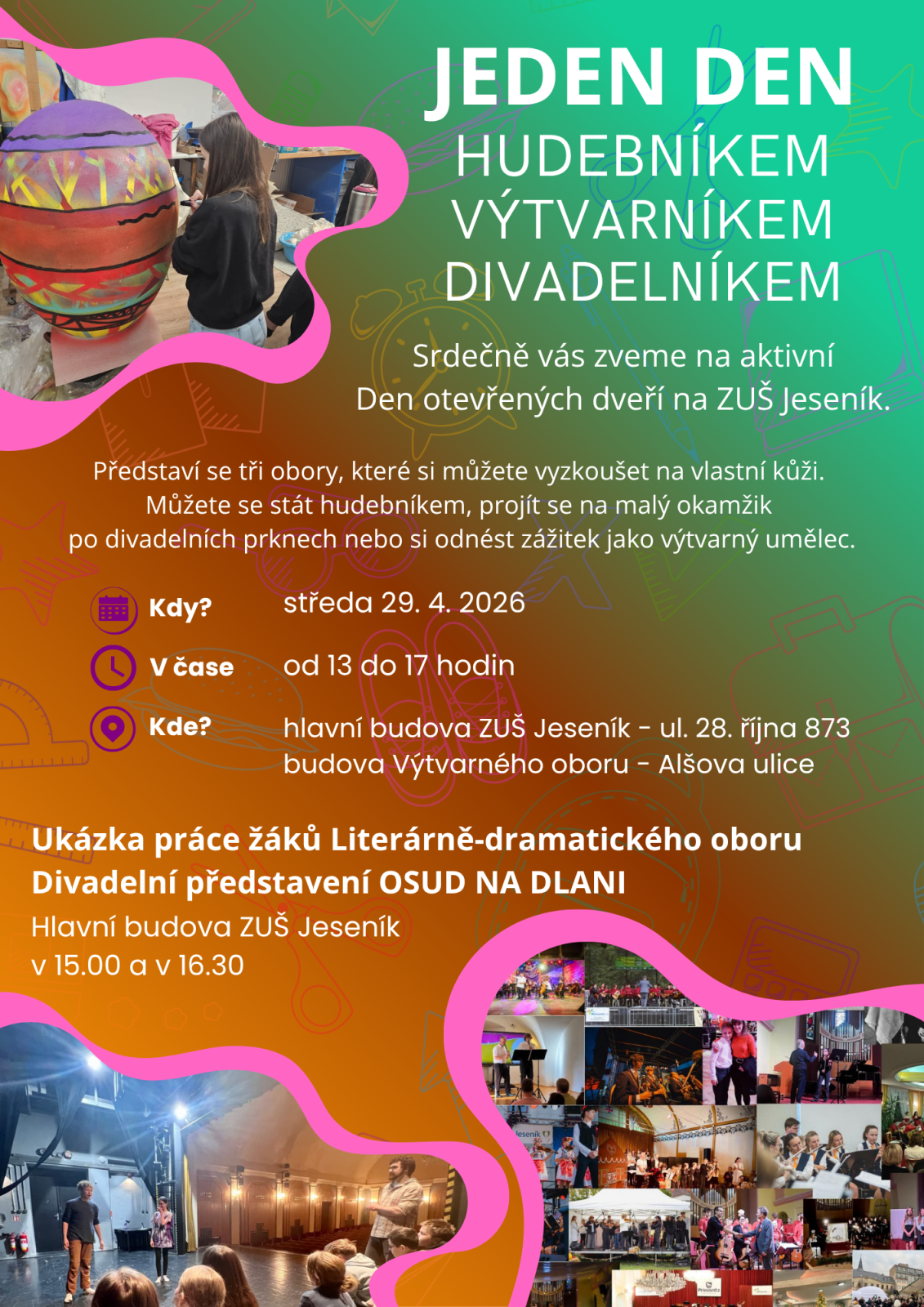 Poslední změna: 13.04.2026 | čtvrtek30.dubna Byliny byly jiné - Divadlo 30.04.2026 od 18:00 do 19:30 hod. Divadlo Petra Bezruče, Jeseník | Mapa představení LDO ZUŠ Jeseník |