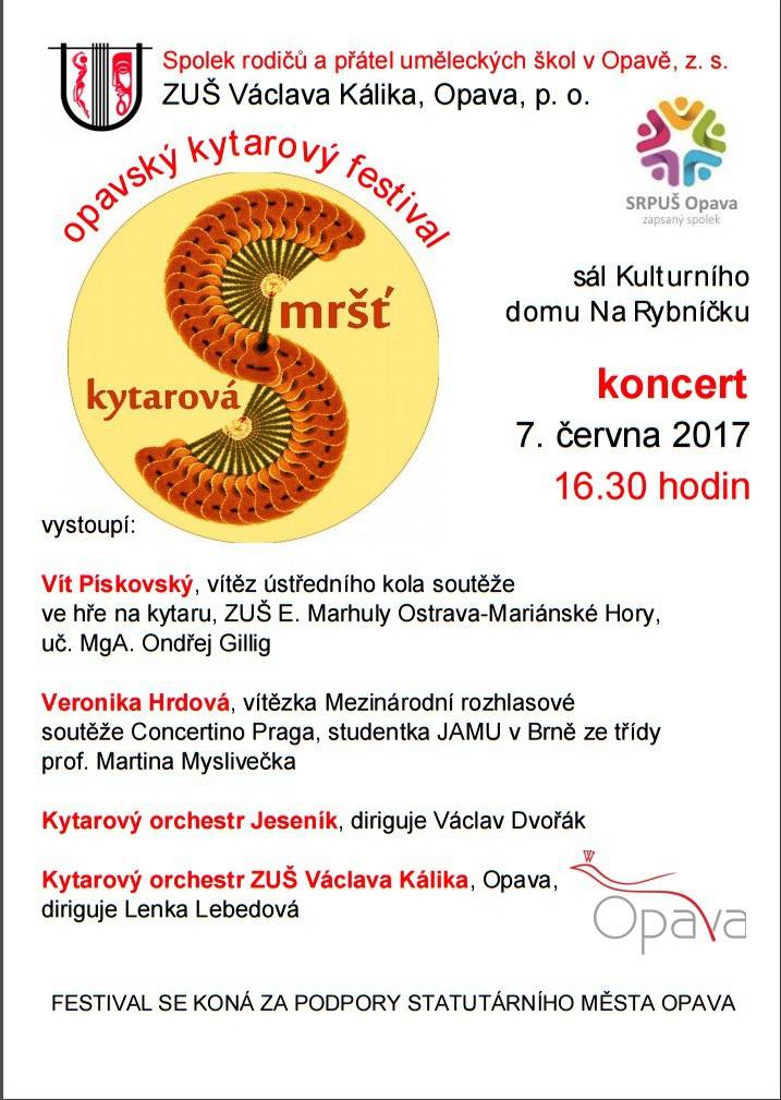 Kytarový orchestr ZUŠ Jeseník je pozván do Opavy na další ročník festivalu "Kytarová Smršť". Dopoledne se bude konat seminář pro učitele ZUŠ a odpoledne proběhnou zkoušky pozvaných hudebníků. Kytarová smršť vyvrcholí koncertem, na kterém vystoupí se svým recitálem vynikající kytaristka Veronika Hrdová a dva kytarové orchestry: Kytarový orchestr ZUŠ Jeseník a Kytarový orchestr ZUŠ Václava Kálika Opava. Zazní i dvě společné skladby všech zúčastněných kytaristů. Celá akce proběhne ve středu 7.června 2017 v kulturním domě Na Rybníčku v Opavě. Akci připravuje p. učitelka a vedoucí Kytarového orchestru ZUŠ Opava Lenka Lebedová.
