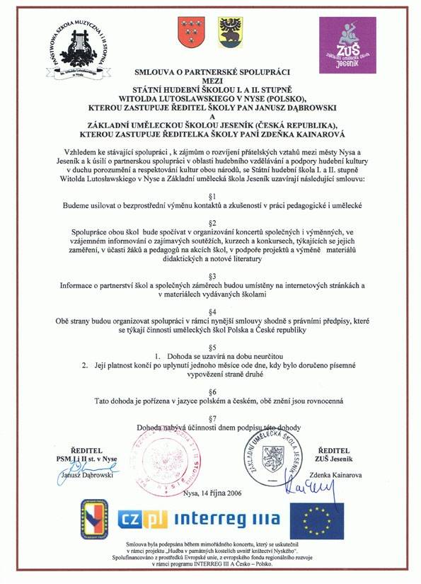 Stáhnout Smlouva o partnerské spoluprácimezi Státní hudební školou I. a II. stupně Witolda Lutoslawskiego v Nyse (Polsko) a Základní uměleckou školou Jeseník (ČR) Obrázek | Velikost souboru: 125 Kb